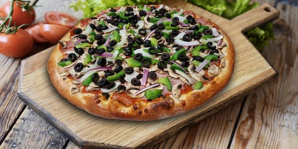 Pepperoni, ham, mushrooms, onion, green bell peppers, olives.